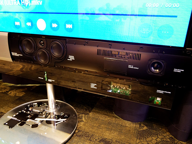 製品を見て気づくのは、巨大なスピーカーがテレビ画面の下にあることだ。まるでサウンドバーとテレビが一体化したようなデザインとなっている。同社ではこのスピーカー部を「SoundCentre」と呼んでおり、左右だけでなく、センターチャンネルにもスピーカーユニットを装備。合計6ユニットを内蔵し、合計で最大450Wの出力を備える。