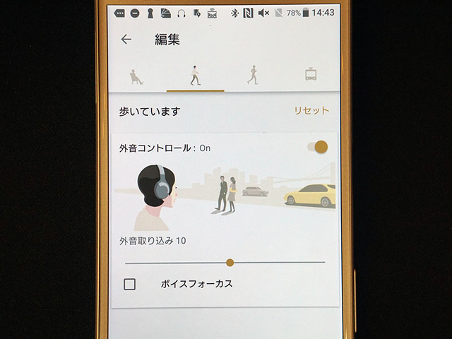 また、「外音コントロール」機能も設定可能。従来機「MDR-1000X」では機能のオン/オフ切り替えのみが行えたが、今回から外音取り込みレベルを1〜20の間で好みに合わせて調整できるようにもなった。