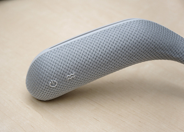 人間の肩に乗せ、スピーカー上部から音が広がるスピーカー。同社では「音に包まれるような体験が得られる」としている。スピーカー部の質量は約335g。