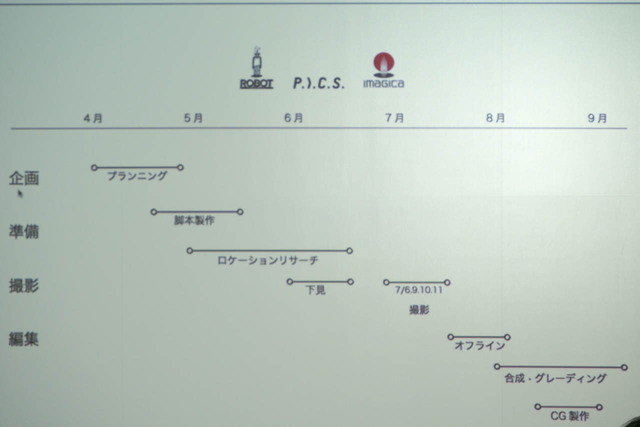 制作スケジュールの特徴として、映像処理の工程が従来より非常に長く取られた。グレーディングなどHDRならではの処理や、CGと実写の合成、解像度を維持しながらのノイズ除去に労力を要したという。