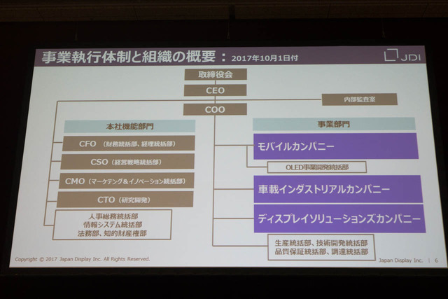 同社は10月1日から、事業カテゴリー毎のカンパニー制に移行。モバイル、車載インダストリアル、ディスプレイソリューションズという3カテゴリーの事業カンパニーを設立し、権限を各カンパニーに大きく委譲することで、収益責任の明確化と迅速な意志決定を行えるようにするとした。同時に本部機能も420名の管理職を280名に削減するなどの簡素化を行うとしている。