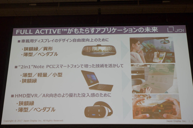 ジャパンディスプレイは、スマートフォン/タブレット画面向けに開発した新ディスプレイ「FULL ACTIVE」と、同社の今後の経営方針に関する発表会を開催した。