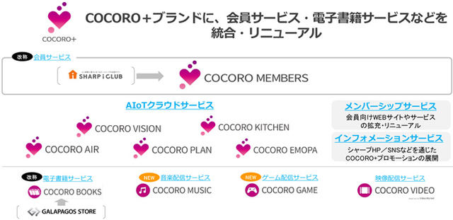 既存サービスについてはCOCORO+ブランドへ改称。会員サービス「SHARP i CLUB」は『COCORO MEMBERS(ココロメンバーズ)』に、電子書籍サービス「GALAPAGOS STORE」は『COCORO BOOKS(ココロブックス)』へとそれぞれ変更する。