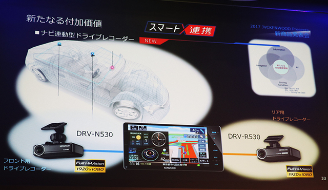 同社ではナビと周辺機器との連携システムを「スマート連携」と呼称しており、ナビ連携ドライブレコーダーやETC、ハイレゾ対応スピーカー、フロント/リアカメラとのシステム提案を進めていくとしている。