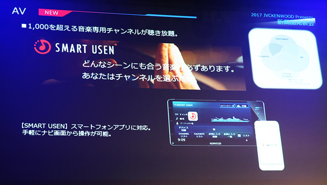 また、スマホ用ラジオ型定額制音楽配信アプリ「SMART USEN(月額490円・税抜)」にも対応。スマートフォンとBluetooth接続することで、ナビ画面からもチャンネル選択して音楽再生が可能となる。他にも、USBやSDカード、ナビ内蔵メモリに収録されている全楽曲/動画を操作できる「マルチAVブラウザ」や、リスニング環境設定といった各種サウンド調整機能も装備する。