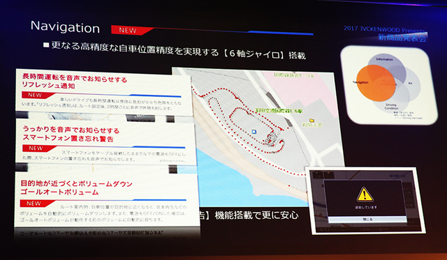 ナビ機能では、新たに正しい自動車位置の情報取得を可能にする「6軸ジャイロ」を搭載。3軸ジャイロと3軸加速度センサーにより傾いた路面でも正しい値が取得できるとのこと。さらに高精度3Dジャイロセンサー、グロナス衛星対応GPSも搭載し、位置ズレの少ないより高精度なナビ情報を可能にする。その他、2時間ごとに休憩を促すリフレッシュ通知や逆走警告機能なども新たに装備する。