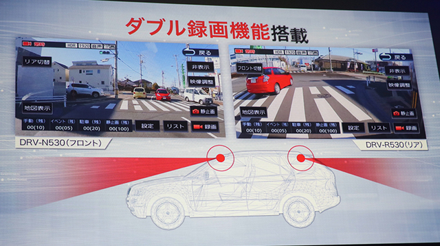 ナビ新製品と合わせて、独立型ドライブレコーダー「DRV-830」「DRV-W630/630」、ナビ連携型ドライブレコーダー「DRV-N530(フロント用)/R530(リア用)」、ETC車載器「ETC-N7000/N3000」も発表された。