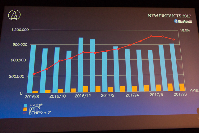 2016年8月時点で5%強だったBluetoothヘッドホンのシェアが、2017年8月には15%強まで伸びたという国内ヘッドホン市場のデータを挙げながら、松永氏はなぜオーディオテクニカがBluetoothに力を入れるのか説明していった。