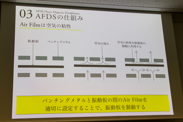 AFDSは、振動板を高精度な開口を持つパンチングメタルで挟み、振動板とパンチングメタルの間にある薄い空気の層(エアフィルム)の摩擦をコントロールする事で振動板を制動する仕組み。同社は2017年4月に開催されたヘッドホン祭にて技術発表を行っている(関連ニュース)。