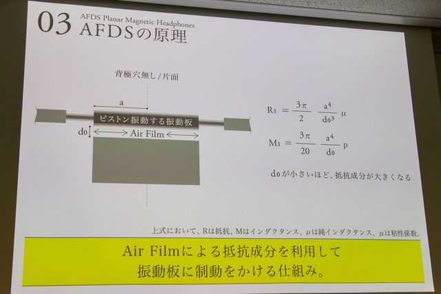 本機の中核技術となるのが「AFDS」(Air Film Damping System)だ。このAFDSでは、平面磁界型ヘッドホンで問題となる振動板のダンピングに「薄流体層」の原理を応用。振動板がマグネットに接触することを回避しつつ、高域再現を犠牲にせず豊かな低域再現や開放感を実現することができる。