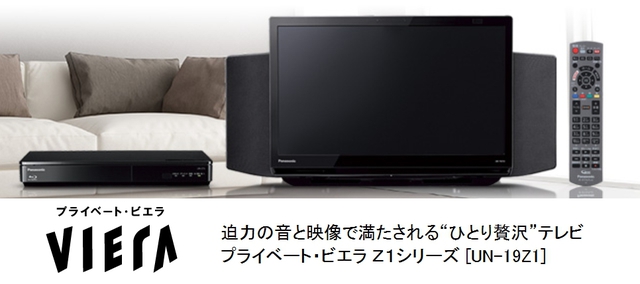 プライベート・ビエラZ1シリーズは、19型のディスプレイ部とブルーレイ/DVDドライブも搭載するチューナー部サブウーファーとのセット商品。4つのフルレンジスピーカーを内蔵した最大40Wの2.1chスピーカーを搭載。これにより、「ポータブルテレビとしては他に類を見ない、迫力ある重低音を実現した」としている(関連ニュース)。