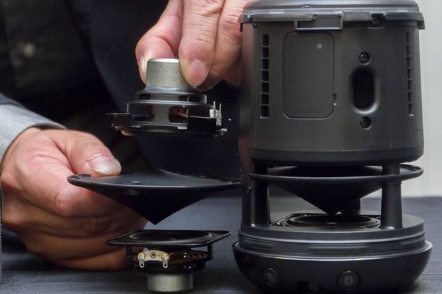 本製品は上記のようなスマートスピーカーとしての基本機能を押さえた上で、音質を高めるための様々な工夫を行ったことが特徴。スピーカーは明瞭なボーカル帯域を再生する直径約48mmのフルレンジユニットと、自然な低域を目指した約53mm大振幅サブウーファーの2ウェイ構成。2つのユニットは縦方向に向かい合わせで設置され、ユニット間には高剛性で共振を抑えた2ステージディフューザーを配置して音を360度にバランス良く放射する。実用最大出力は18W。なお「360度スピーカーという構造上、従来のスピーカーと同じ測定方法をとることが難しいため」として、再生周波数帯域は非公開となっている。
