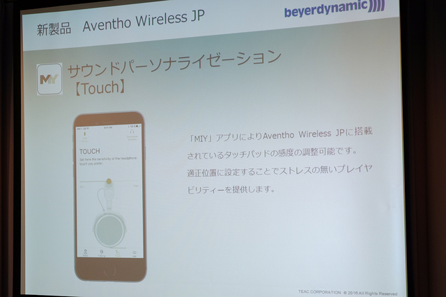 「MIY」アプリによるサウンドパーソナライゼーション機能を搭載。このMIYアプリは、人間の聴覚について科学的・医学的な研究を行い、ユーザーにあったサウンドを提供できる技術を持っているMimi Hearing Technologiesと共同開発されたもの。これにより、個々のユーザーの聴覚にあったサウンドをAventho Wirelessに伝送することができるという。