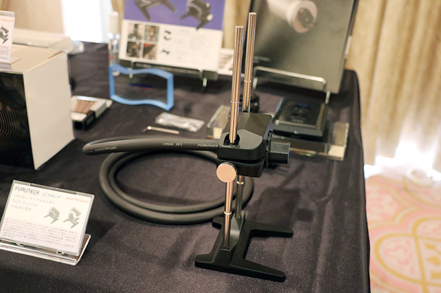 コネクター・ケーブルホルダーも展示。DACなどオーディオ製品につなぐケーブル置きスタンドで、9月末頃からの発売以降人気の製品だという。