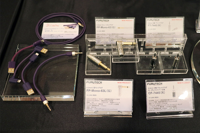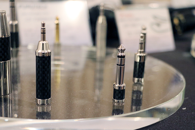 フルテックでは新製品として、ワンピース構造の6.3mmL型/ストレート型のモノプラグと4.4mm5極プラグを出展。ワンピース構造とすることで信号がより伝わりやすく、カーボンファイバー仕様のモデルはより振動を抑制するとのこと。