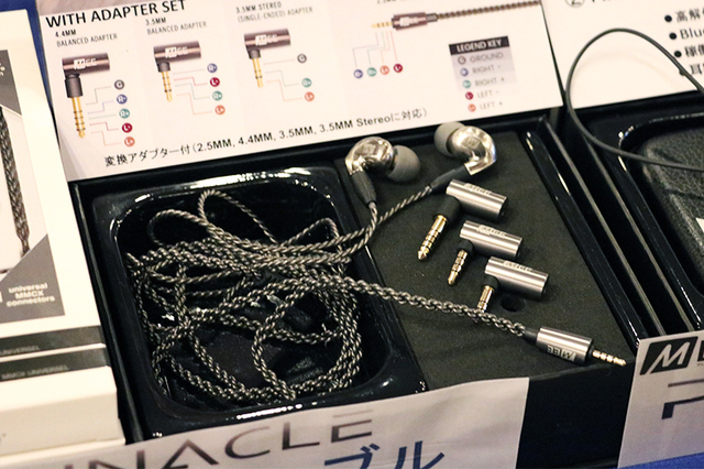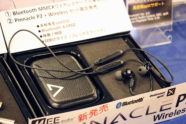 宮地商会のブースでは、特にMEE audioのイヤホン“PINNACLE”シリーズのバランスケーブル&変換プラグセットと、MMCX端子を装備したBluetoothケーブルの試聴が人気。エントリーイヤホン「PINNACLE P2(関連ニュース)」とBluetoothケーブルのセット販売も予定しており、それぞれ単体で購入するよりも約3,000円安く購入できるとのこと。また、Dekoni Audioのイヤーチップ「MERCURY」「Gemini」の無料配布も行われており、1人につき1ペアがもらえるとのこと。