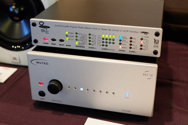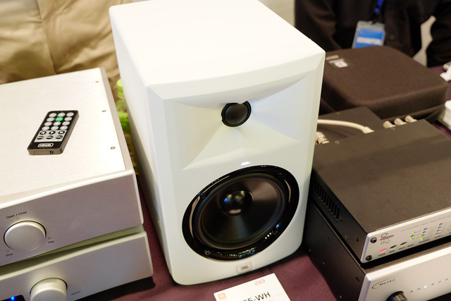 ヒビノのブースでは、MUTECブランドのクロックジェネレーター「MC-3+USB」と「REF10」を用いたヘッドホンアンプシステムが試聴できるようになっていた。「ヒビノブースでのクロックの試聴が目当てで会場に来てくれた方もいる」(担当者)。また、JBLプロフェッショナルのアクティブスピーカー「LSR305」のホワイトカラーモデルも参考出展されていた。