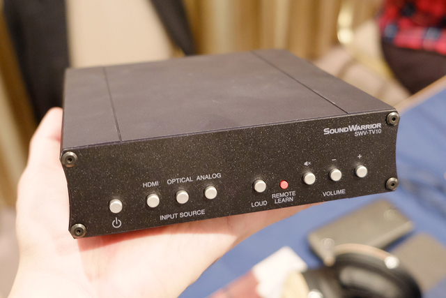 SOUND WARRIORは、ヘッドホンが試聴できるシステムを展示する一方、「テレビ用外付けスピーカーアンプ」を参考出展。テレビからHDMIで受けた音声信号をステレオスピーカーで再生させるためのアンプで、「サラウンドシステムなどとは違ったアプローチで、オーディオ的にテレビを良い音で楽しむことを目指した」という。テレビのリモコンに連動し、電源やボリューム調整が行える。