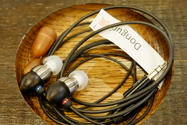 音茶楽のブースでは、削り出しの楓無垢材を拭漆仕上げ(黒漆)としたイヤホン「Donguri-楓」「Donguri-楓Balance」を展示。Donguriシリーズの第三弾となるモデルで、塗装はオイル、漆、黒漆仕上げを、リアキャビネット素材は楢材、欅材、楓材をそれぞれ試作した結果として、楓と黒漆に決定されたという。