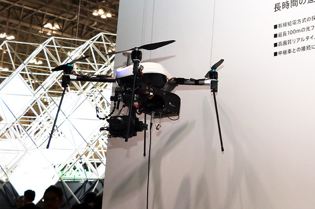 そのほか、有線ドローンシステムの参考出展も目を引いた。エアロセンス社とともに構築したシステムで、有線で給電するためバッテリー切れの心配がないほか、映像を光ファイバーで伝送するため、非圧縮・高画質なリアルタイム映像伝送を行えるという利点がある。