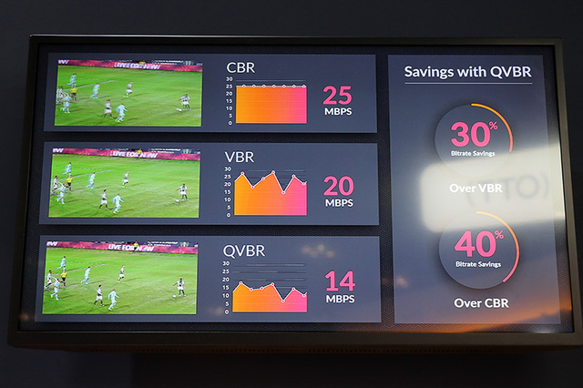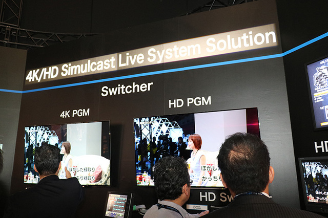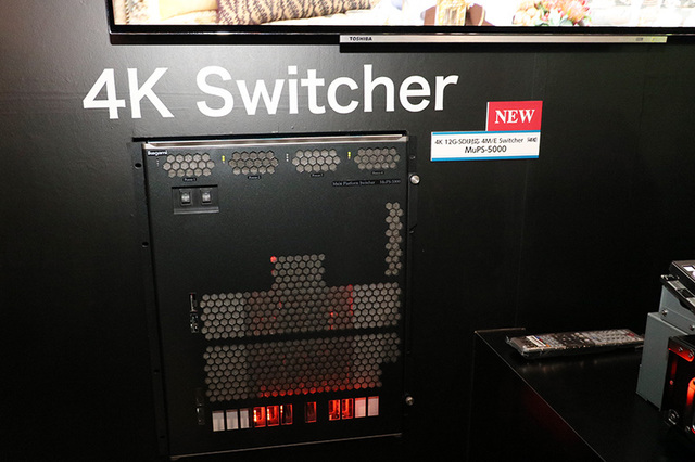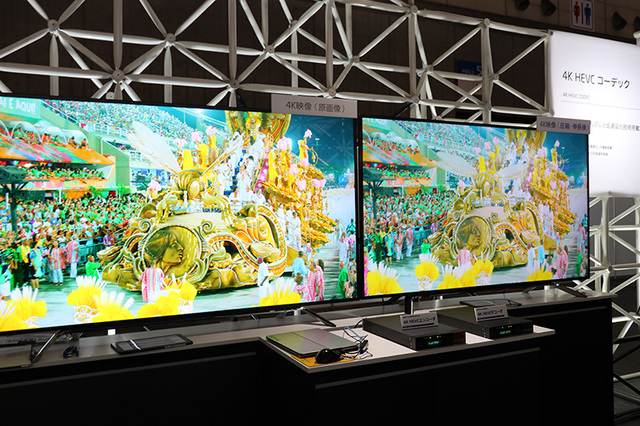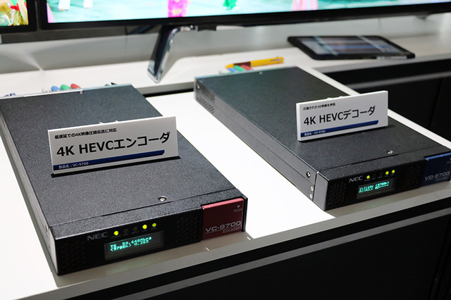 NECでは、HEVCの低遅延対応コーデックが目を引いた。エンコーダーの「VC-9700」とデコーダーの「VD-9700」で構成されており、サイズはハーフラックサイズ。H.265 Main 10@L5.2 High Tierに対応している。独自の低遅延技術を使用することで、フルHDの場合20msec(約1フレーム程度)、4Kの場合は99msec(約6フレーム程度)の遅延に抑えられる。画質も10ビットエンコード、クロマフォーマット4:2:2に対応している。なお、上記は低遅延モードの数値で、通常遅延モードの場合、遅延は500ms - 1000ms程度となる。