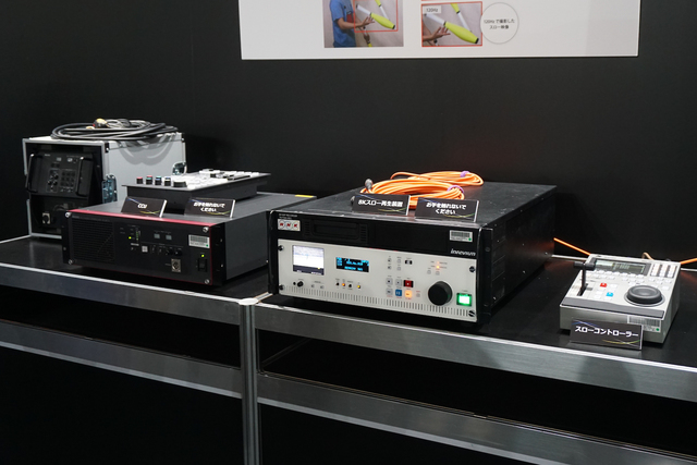 フルスペック8K用に開発された、120Hz撮影が可能なカメラと記録装置を用いて、8K映像の2倍速スローモーション再生する装置のデモも行っていた。撮像装置については、カメラヘッドに小型キューブカメラを用い、CCUと通常の光カメラケーブル1本で接続。情報量が大きい8K 120kHz映像の伝送を、光波多重技術を使うことで実現。最大1kmまで伝送が行えるという。