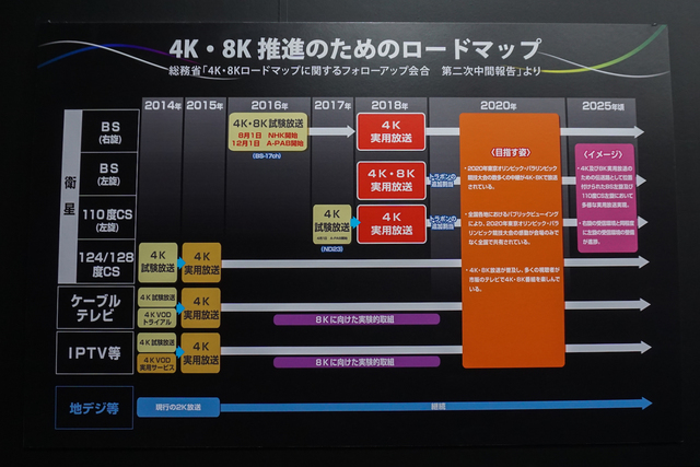 NHK/JEITAのブースは、入り口には「8K」という巨大なパネルを掲げ、2018年の4K・8K実用放送開始に向けた様々な施策や技術をアピールした。ブース内では4K・8K推進のためのロードマップが紹介され、2020年東京オリンピック・パラリンピックで数多くの中継が4K・8Kで放送されることを目指すとした。
