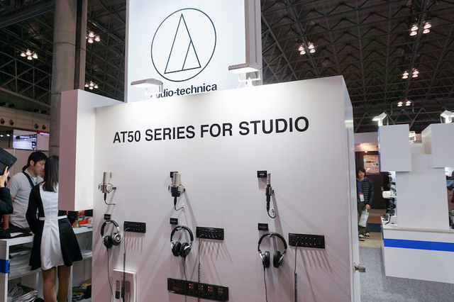 オーディオテクニカはマイクロフォンや業務用ワイヤレスシステムなど、プロ向け製品を一斉展示。「AT50シリーズ」は同社最新のコンデンサーマイクロホンで、本機の音を「ATH-M70x」などの同社のモニターヘッドホンで実際に聴いて確かめることができた。また、楽器収録用のマイクを、実際にドラムに装着したかたちで展示していた。