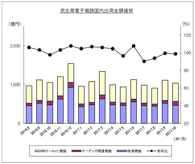JEITAは、2017年10月の民生用電子機器国内出荷実績を発表した。10月の国内出荷金額は1,035億円(前年比98.7%)となった。
