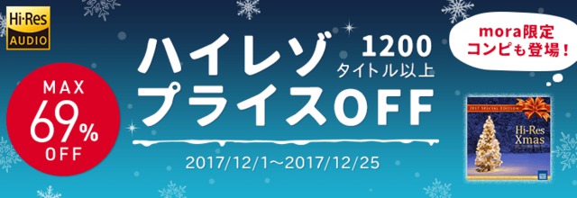 (株)レーベルゲートは、同社が運営する音楽配信サイト「mora」にて、約1,200タイトルのハイレゾ音源が最大69%オフになる「冬のハイレゾプライスOFFキャンペーン」を開始した。期間は、12月25日まで。