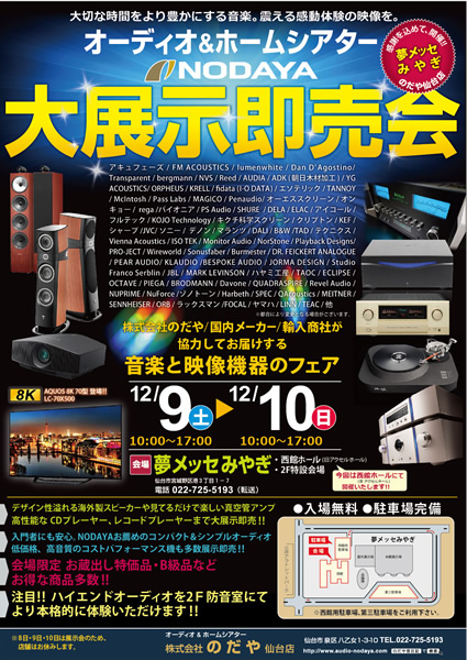 オーディオ・ホームシアター専門店「のだや」は、展示即売会を12月9日(土)・10日(日)に仙台「夢メッセみやぎ」で、12月16日(土)・17日(日)に郡山「ビッグパレットふくしま」でそれぞれ開催する。