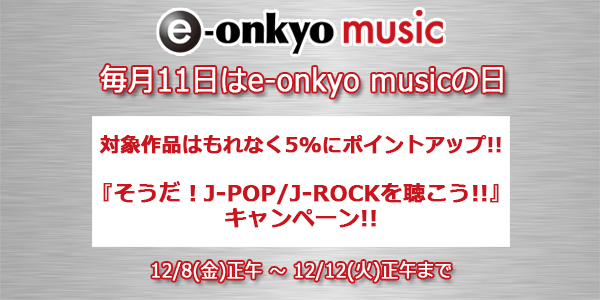 オンキヨー&パイオニアイノベーションズ(株)は、より多くの人にハイレゾ音源をもっと楽しんでもらえるよう、毎月11日を「e-onkyo musicの日」とし、イベントを開催している。12月は、J-POP/J-ROCK作品の購入ポイントが最大で7%にアップする「そうだ!J-POP/J-ROCKを聴こう!!」を、本日12月8日から12月12日まで実施する。