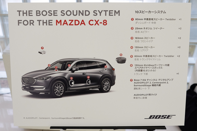 CX-8は、マツダの国内向けSUVラインアップにおける最上位SUVとなる、3列シートのモデル。マツダと車両設計の初期段階から共同開発を行ったボーズのサウンドシステムが搭載でき、その丁寧な専用チューニングにより、3列どの席からもバランスのとれた最適音質を聴くことが可能としている。