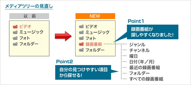 ディーガ以外のテレビやレコーダーでも、録画番組の検索機能が従来よりアップデート。新たに「録画番組」フォルダーを設置し、録画番組とその他の動画を切り分けて保存ができるようになった。また「録画番組」フォルダーでは、7つの項目から見たい番組のスムーズな検索が可能。