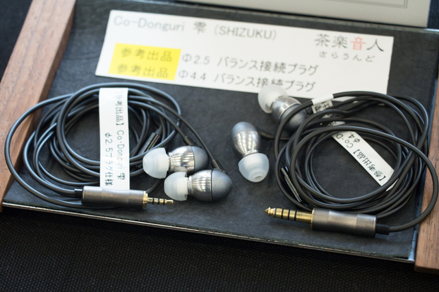 茶楽音人からは、Co-Donguri 雫(SHIZUKU)のフロントキャビネットを真鍮製としたモデルが参考出展。ケーブルはOFC線材が用いられており、GNC分離タイプとしている。また、同製品の2.5mmバランス接続端子モデルと4.4mmバランス接続端子モデルも参考出展されていた。
