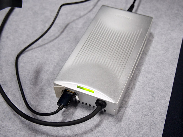 本機は、メガネ型ディスプレイ部と、RGBレーザー光源やバッテリーを搭載した外付けユニットに分かれている。ユニット内でRGBのレーザー光を出力し、それを合波して、光ファイバーケーブルでメガネ部のプロジェクターに伝送する。その後、上述のようにMEMSミラーでスキャンする仕組みだ。外付けユニットのサイズは大きめのポータブルヘッドホンアンプ程度だが、今後、小型化もロードマップに設定されているという。