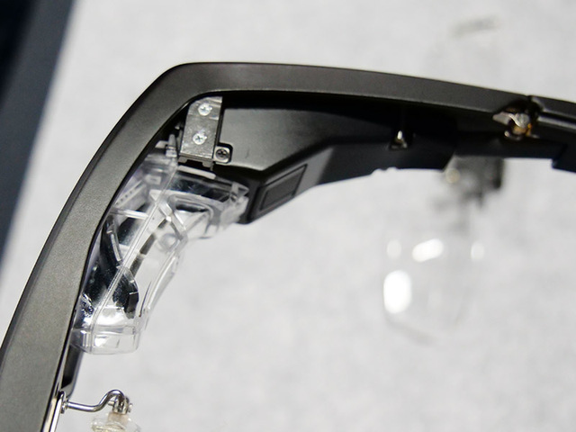 なお、視力が低いと装着時に外界がぼやけてしまう問題は、フレームに度入りのレンズを装着することでクリアできる。本機のキモは、フレームの外側ではなく内側に、プロジェクターとMEMSレンズ、ミラーを実装したこと。これらのデバイス類を別のフレームに付け替えたら、自由なデザインのメガネ型ディスプレイを実現できることになる。