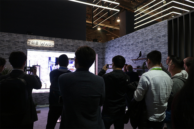 The Wallは、バックライトおよびカラーフィルターを使用せず、独自の光源として自発光するRGBのマイクロLEDを備えたテレビ(関連ニュース)。またベゼルレスデザインで世界初のモジュール式を採用した点を特徴としており、これにより形状やサイズを自由にカスタマイズすることができる。展示スペースにはThe Wallの映像を見にたくさんの人が訪れていた。