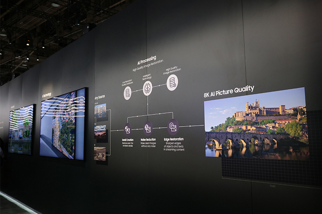 反対側のスペースには、こちらも世界初となる8K AI技術を搭載した8K液晶テレビを出展。AIによる8K映像とネイティブ8K映像の比較展示を行っている。