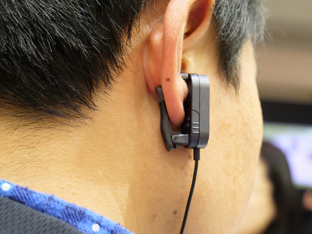 WR-3はワイヤード型のイヤホンで、クリップで耳たぶを挟んで使用する。振動子が骨を振動させることで、直接聴覚神経に音を届ける仕組みだ。
