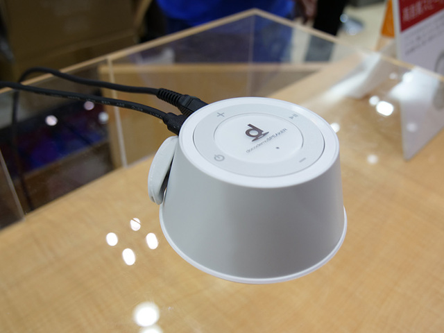 そのほかBoCoは、φ52mmの振動デバイスを使って、気やガラスなど、置いたものを直接揮わせて音を出すスピーカー「dokodemo SPEAKER」も出展。昨年クラウドファンディングで出資を募っていた製品で、その際は限定1,000名に16,000円で販売していた。