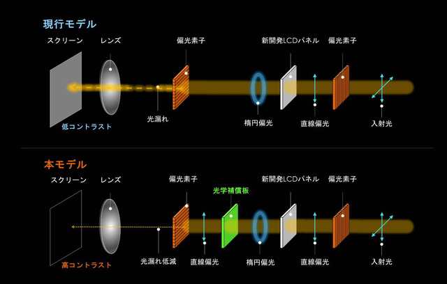 両機種ともに新開発の高輝度1インチLCDパネルを搭載。レーザーダイオードの駆動は独自の新制御アルゴリズムによって最適化しており、高輝度を長時間維持できる。VPL-FHZ120はそれに加えて光学補償板を組み合わせ、安定した明るさと鮮やかな色再現能力を備える。