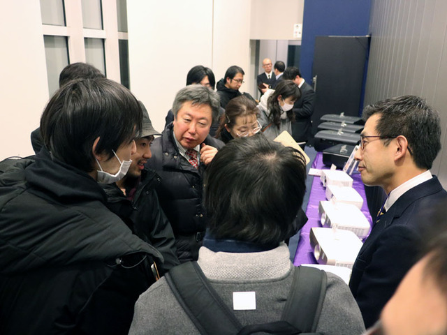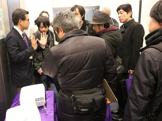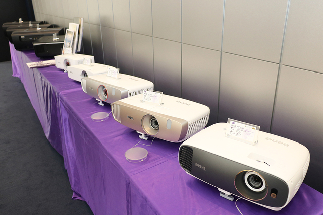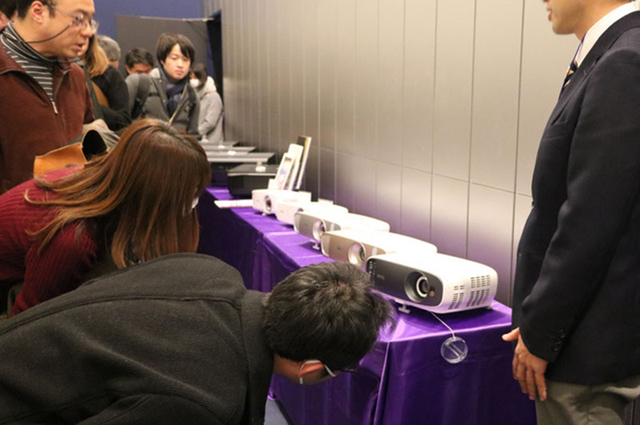 視聴会が終わると、会場後方に用意されたBenQプロジェクターの展示スペースに参加者が殺到。実際にHT2550を持ち上げて小型・軽量さを確認したり、細部をチェックするなど、映像を観ることで関心が高まった様子が見て取れた。