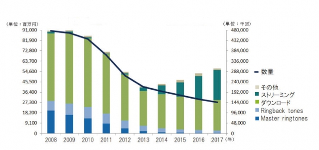 日本レコード協会は、2017年第4四半期(10-12月)の音楽配信売上げ実績を公表した。売上げ実績は、着メロ、着うた、ダウンロード、ストリーミング(広告収入含む)それぞれの収入を合計したもの。