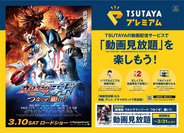 株式会社TSUTAYAは、「ウルトラマンシリーズ」の最新劇場作品『劇場版 ウルトラマンジード つなぐぜ! 願い!!』の3月10日劇場公開を記念して、『ウルトラマンジード』のTVシリーズ全25話を、『TSUTAYAプレミアム』の動画見放題サービスにて3月31日までの期間限定で配信開始した。
