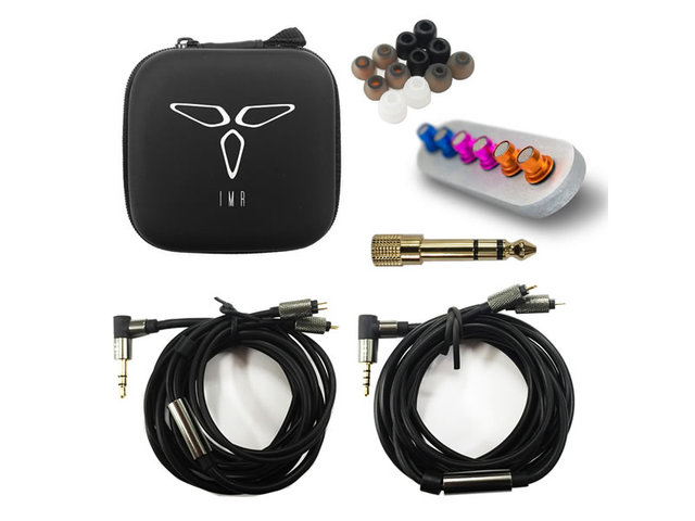 ケーブルはカスタム2pinのデタッチャブル式で、3.5mmバランスケーブルと3.5mmアンバランスケーブルを1本ずつ同梱。6.5mm変換アダプタも付属する。そのほかインピーダンスは32Ωで、感度が108 +/-3dB。