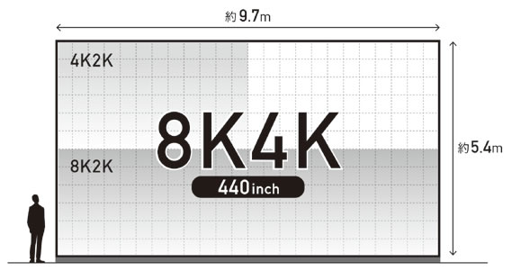 イベント業者など向けのサービスで、8K4K 440インチ構成を基本に、ワイド8K(7,680×2,160)400インチ、4K(3,840×2,160)220インチ構成の計3タイプを軸に展開。イベントやプロモーション、ショールームや展示施設などにおける超高精細映像に対するニーズに応えていくとしている。