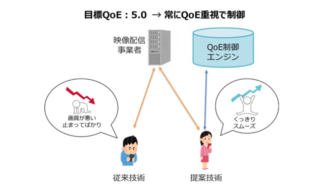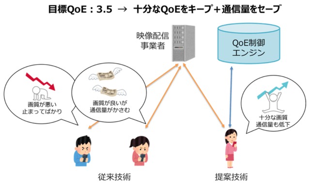 本技術では、動画の視聴ビットレートや再生停止時間などをもとに独自のアルゴリズムにより配信中の動画のQoEを評価。その上でユーザーの環境を考慮した通信品質予測を行い、あらかじめ設定した目標とするQoEを達成するよう、動画配信時のビットレートを最適に制御するものとなる。これにより、動画視聴のQoEを最大化して配信すること、十分なQoEを保ちながら通信量を削減しつつ配信することが可能としている。