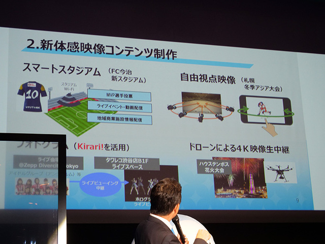 独自開発する「新体感映像コンテンツ制作」については、FC今治と提携する「スマートスタジアム」や「自由視点映像」、「フォトグラム」、そして「ドローンによる4K映像中継」などの事例を紹介。これらをさらに進化させていく。