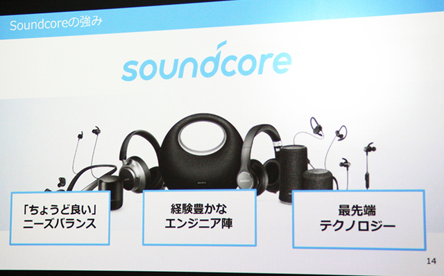 Soundcoreのブランドスローガンは「HEAR IT. FEEL IT」。「ちょうどよいニーズバランス」「経験豊かなエンジニア陣」「最先端テクノロジー」の3つをブランドの強みとして展開していく。